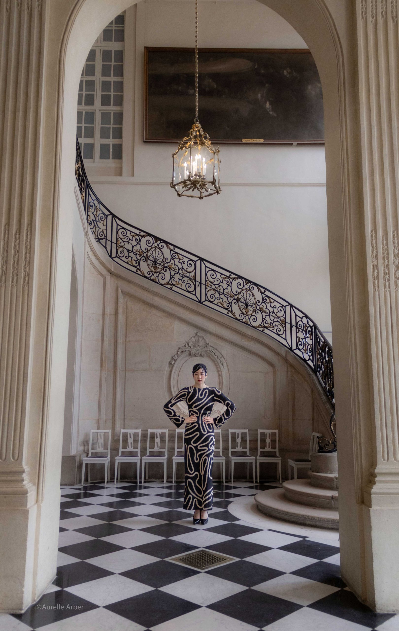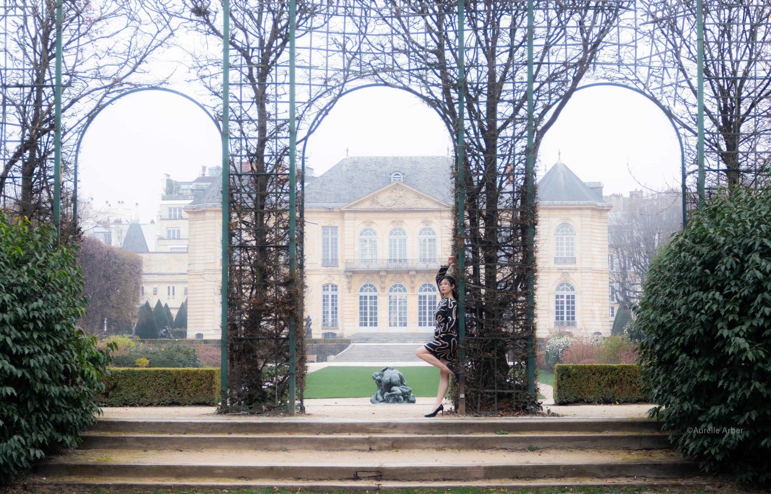 Au cœur du Musée Rodin, le shooting prenait des allures de scène chorégraphiée. La modèle Ako Maihama avançait avec une élégance fluide, sa robe noire ornée de cercles en mouvement et sa couronne créant des jeux de lumière à chaque pas. Autour d’elle, les sculptures monumentales de Rodin demeuraient immobiles, témoins silencieux de cette modernité en pleine effervescence.